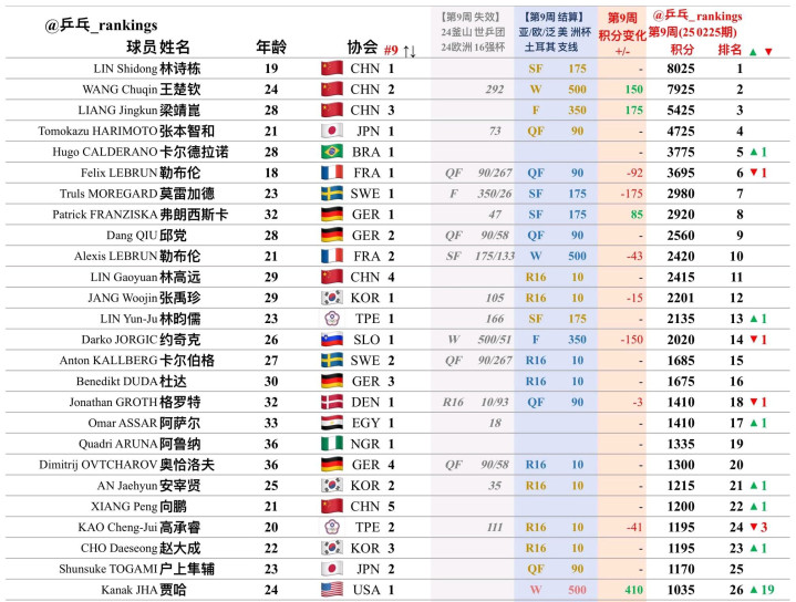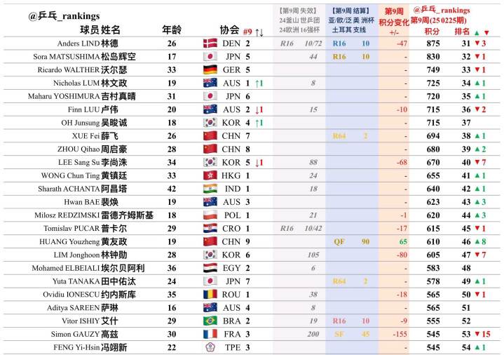 法国选手菲利克斯.勒布伦排名下滑了一位来到了世界第六,由于他在欧洲16强杯赛无缘半决赛,积分出现了减少。不过在三月份的仁川冠军赛,只要他在比赛当中表现突出,依然有机会反超雨果。