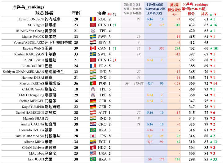 加拿大老将王臻在泛美杯打进了男单决赛,获得了259个有效积分,目前排第66位,他是新一期世界排名当中上升速度最快的选手,直接上升了101位。巴西选手尤蒂打进了泛美杯的半决赛,上升了33个名次,目前世界排名85位。